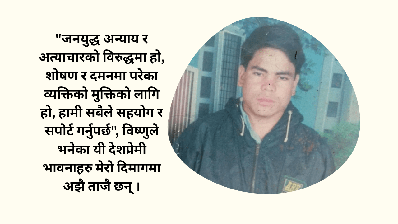 <span;>समय यसरी बितिरहेको थियो । वि.स. २०५२ साल फागुन १ गते देखि देशमा जन युद्ध शुरु भयो । विष्णुलाई जनयुद्धले छोइसकेको रहेछ । “जनयुद्ध अन्याय र अत्याचारको विरुद्धमा हो, शोषण र दमनमा परेका व्यक्तिको मुक्तिको लागि हो, हामी सबैले सहयोग र सपोर्ट गर्नुपर्छ”, विष्णुले भनेका यी देशप्रेमी भावनाहरु मेरो दिमागमा अझै ताजै छन् । जनयुद्व जिन्दावाद ! भनेर कापीका पानाहरुमा लेखेका अक्षरहरु विष्णुले मलाई देखाउँदा मैले पनि आफू हिड्ने बाटोका ढुङ्गाहरूमा खरीले जनयुद्ध जिन्दावाद भन्दै लेख्न थाले । कापीका पानाहरूमा जनयुद्ध जिन्दावाद भनेर कोर्न थाले । मैले खासै राजनीति बुझेको थिइन, जनयुद्व बुझेको थिईन तर पनि विष्णुसँगको संगतले मलाई देश प्रति माया लाग्न थाल्यो, जनयुद्वप्रति चासो बढ्न थाल्यो । तर पछि कसैले यस्तो लेख्नेलाई प्रहरीले पक्रिन्छन् विष्णुलाई पनि पक्रिन खोजेका थिए भन्ने सुनाएपछि मैले त्यस्तो लेख्न छाडेँ । जनयुद्व शुरु भएपछि फागुन चैत्रमा खासै राम्रोसँग पठनपाठन भएन, म पनि विद्यालय नियमित उपस्थित हुन सकिन । विष्णुबाट मैले धेरै कुराहरु सिक्न बाँकी थियो । २ बर्षको अवधिमा कहिलेपनि हामीले एक आपसमा ख्याल, ठट्टा र हाँसी मजाक गरेनौँ । सधैं गम्भीर भएर कुरा गर्यौं । संघर्षका कथा व्यथाहरु आपसमा साटासाट गर्यौं । सुखदुःखका कुराहरु गर्यौं ।