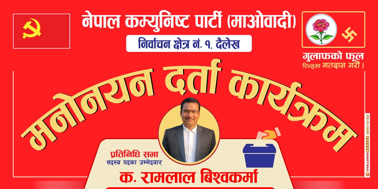 काठमाडौं । प्रतिनिधि सभा सदस्य उम्मेदवारका लागि श्रमिक समुदाय मोर्चा नेपालका केन्द्रीय अध्यक्ष रामलाल विश्वकर्माले दैलेख जिल्लाको निर्वाचन क्षेत्र नं. १ मा उम्मेदवारी दर्ता गर्नु भएको छ । उहाँले आज गृहजिल्ला पुगेर नेकपा (माओवादी) को तर्फबाट उम्मेदवारी दर्ता गर्नुभएको हो ।