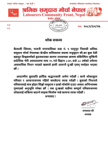 कैलाली । श्रमिक समुदाय मोर्चा नेपालका केन्द्रीय सचिवालय सदस्य मधुसूदन सी.का बुवाप्रति मोर्चाले श्रद्धाञ्जली अर्पण गरेको छ । मोर्चाले आज शोक वक्तव्यमार्फत श्रद्धाञ्जली अर्पण गरेको हो