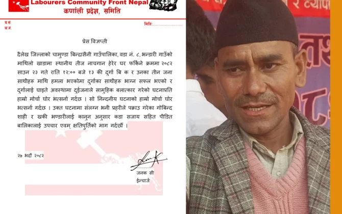 काठमाडौं । दैलेखको चामुण्डा बिन्द्रासैनीमा भएको बलात्कार घटनामा संलग्नहरुलाई कार्वाही गर्न श्रमिक समुदाय मोर्चा नेपाल, कर्णाली प्रदेशले माग गरेको छ । मोर्चाले आज विज्ञप्तीमार्फत सो माग गरेको हो ।   प्रदेश इन्चार्ज जनक सीद्वारा हस्ताक्षरित विज्ञप्तीमा घटनाको...